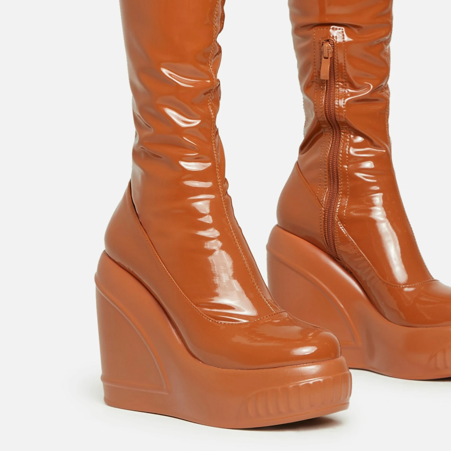 Make them stare with these most wanted boots doll. Featuring a tan patent material, a platform wedge and an over the knee length.