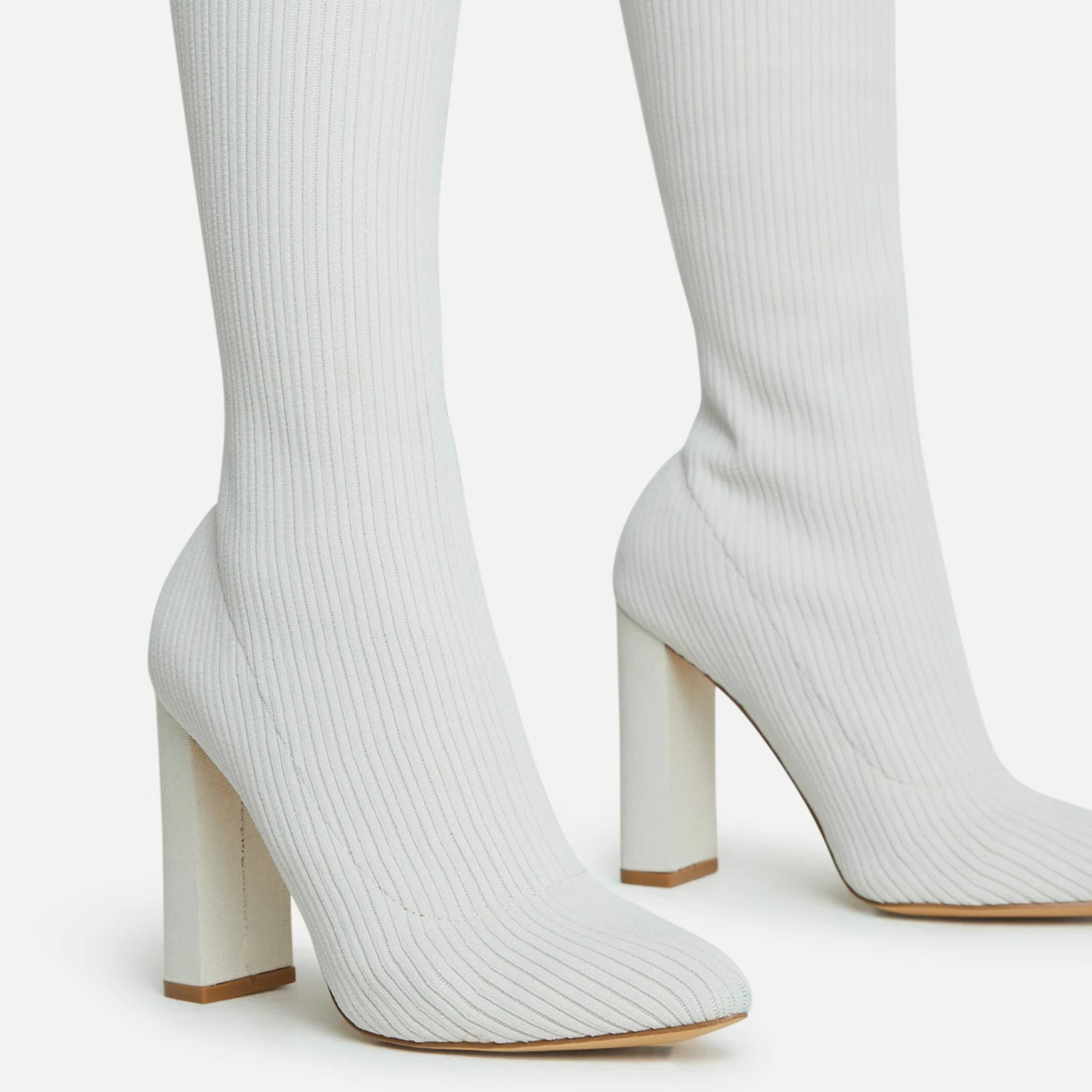Your neutral wardrobe just got a whole lot better doll. Featuring a cream nude knitted material, with ribbed detailing, a pointed toe, block heel and an over the knee thigh high length.