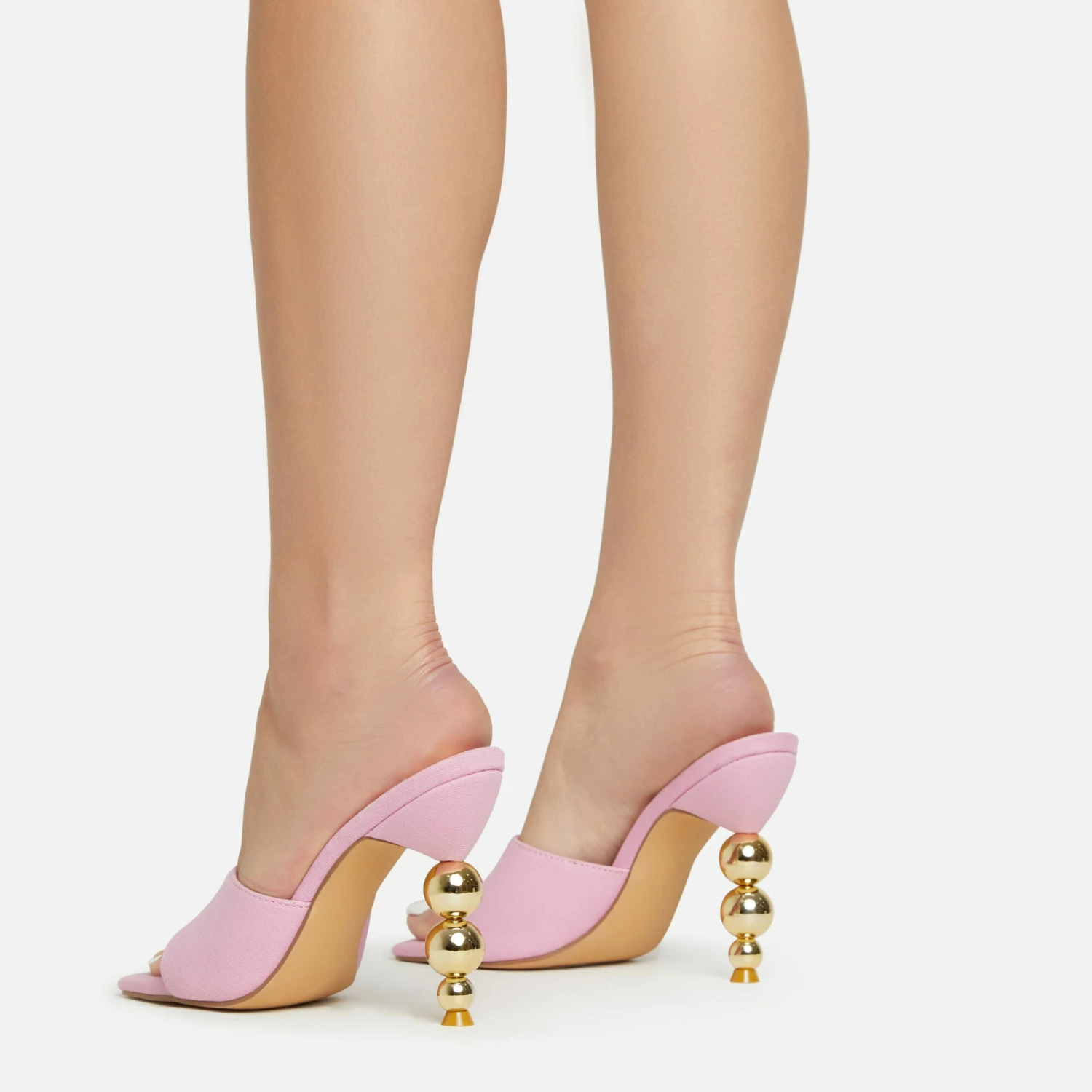 What more could you want with these heels girl. Featuring a pink linen material, a metallic statement heel and a square peep toe.