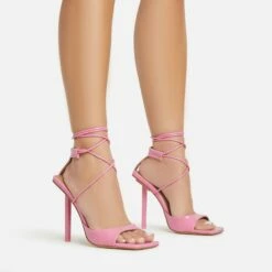 The ultimate boujee heels just landed doll. Featuring a pink patent material, with strappy detailing, a square peep toe, stiletto heel and a lace up finish.
