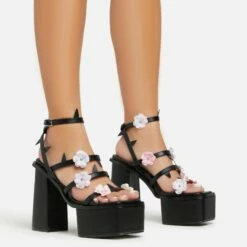 These heels are at the top of our wishlist doll. Featuring a black faux leather material, a triple strap, 3D flower detailing and a platform block heel.