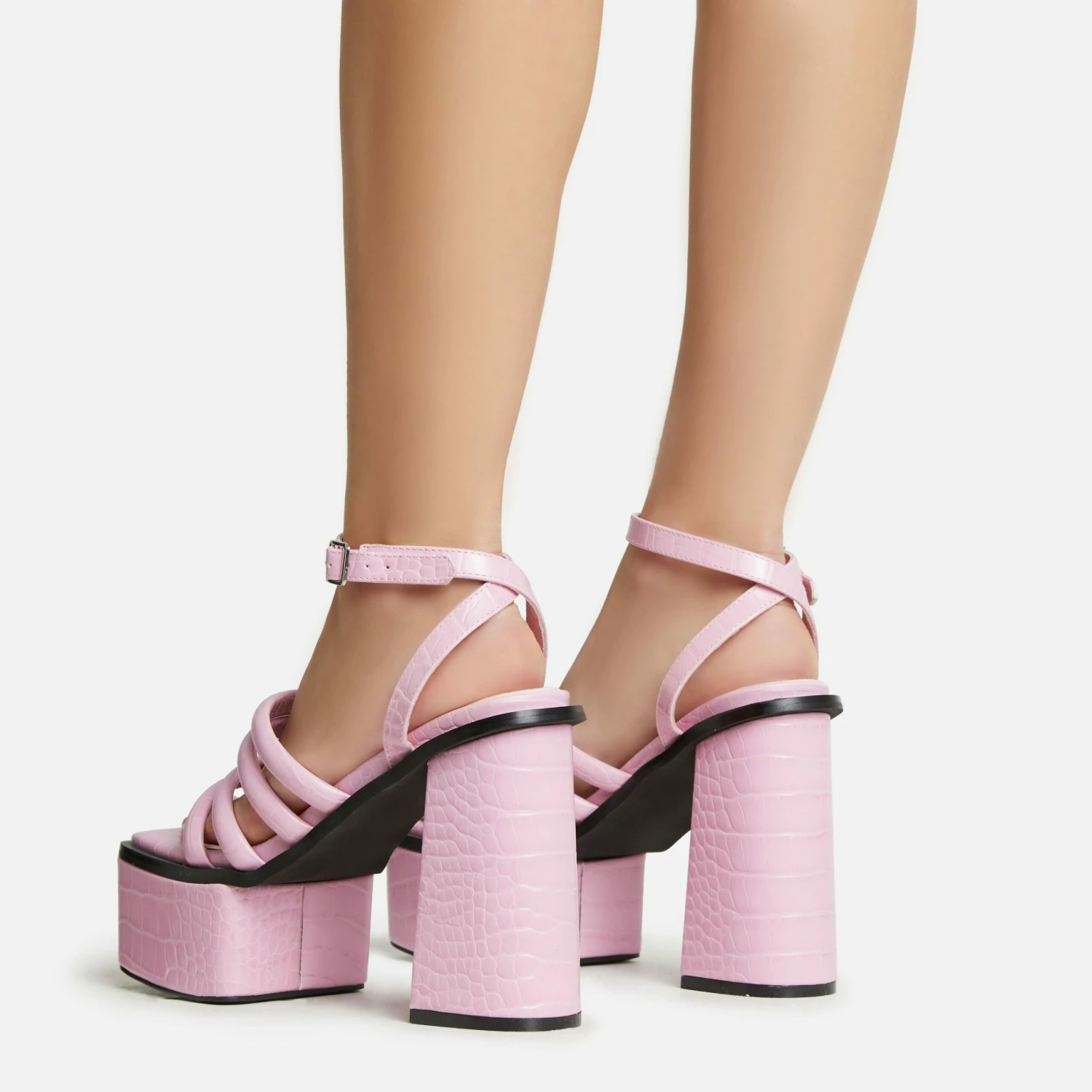 These heels are sure made for walking doll. Featuring a pink faux leather croc print material, a square toe, a platform block heel and a strappy design.