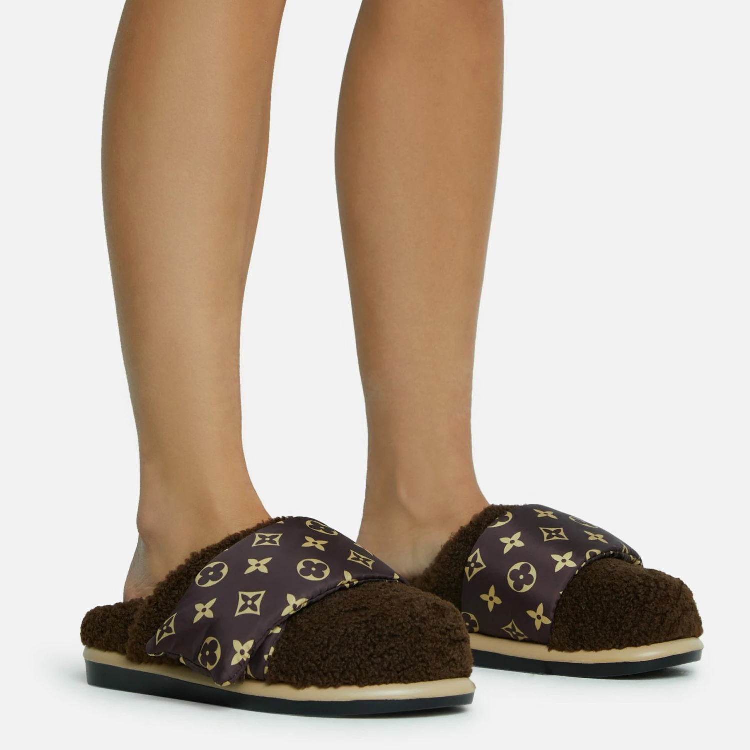 Hit refresh on your new season look with these must haves. Featuring a brown faux shearling material, with a printed velcro strap, a closed toe and a slip-on flat mule design.