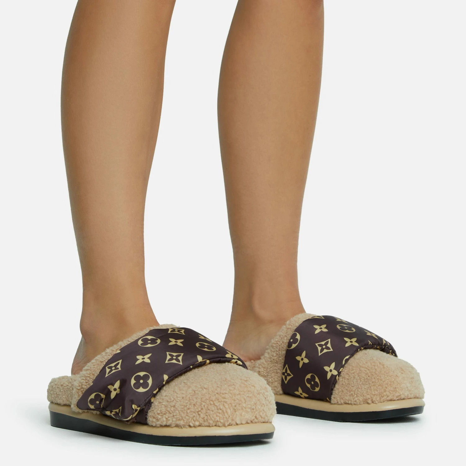 Dreamy neutral hues your wardrobe needs doll. Featuring a nude faux shearling material, with a printed velcro strap, a closed toe and a slip-on flat mule design.