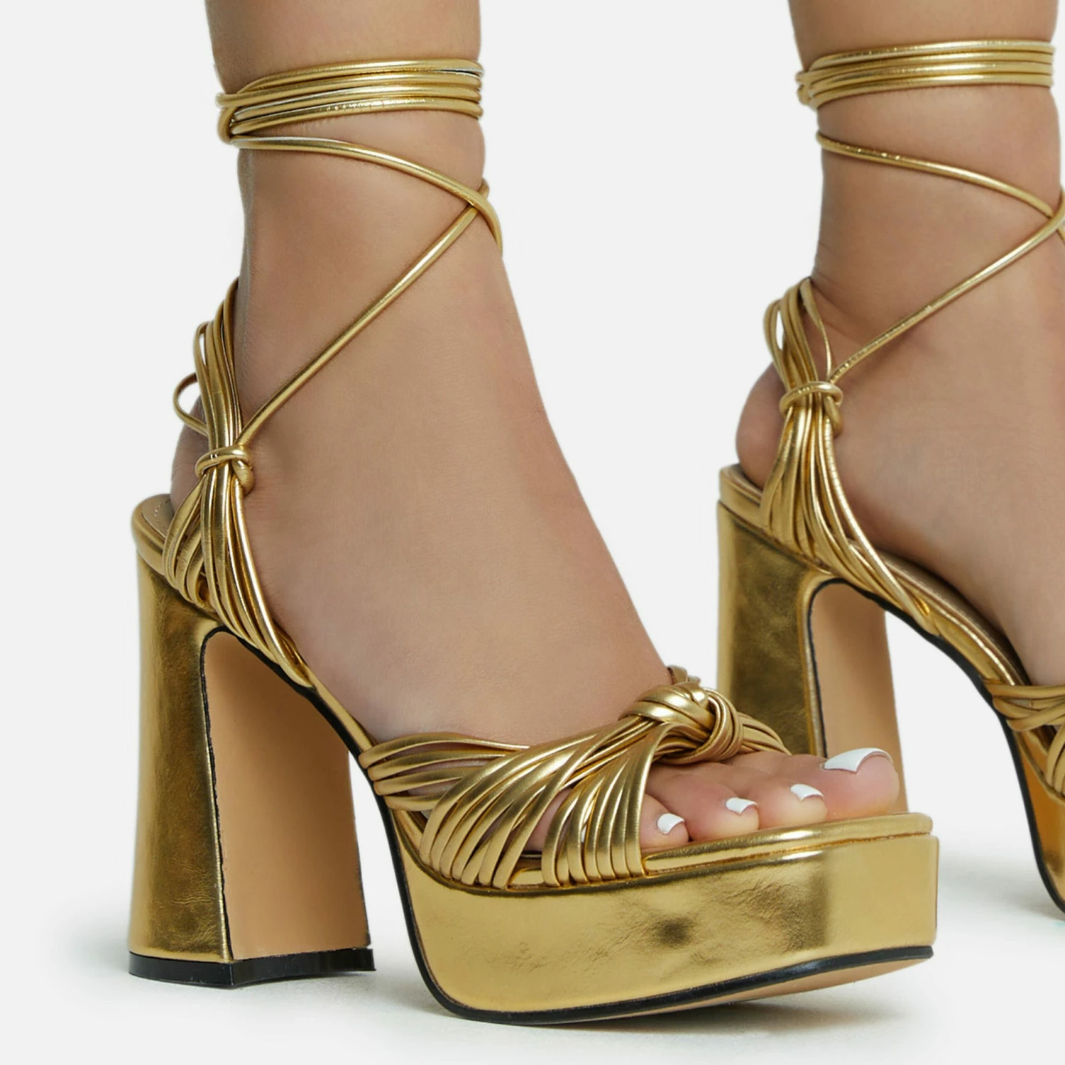 Girl, brand new EGO just landed and we are obsessed. Featuring a gold faux leather material, with knotted strap detailing, a platform sole, block heel and a lace up finish.