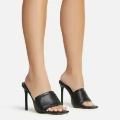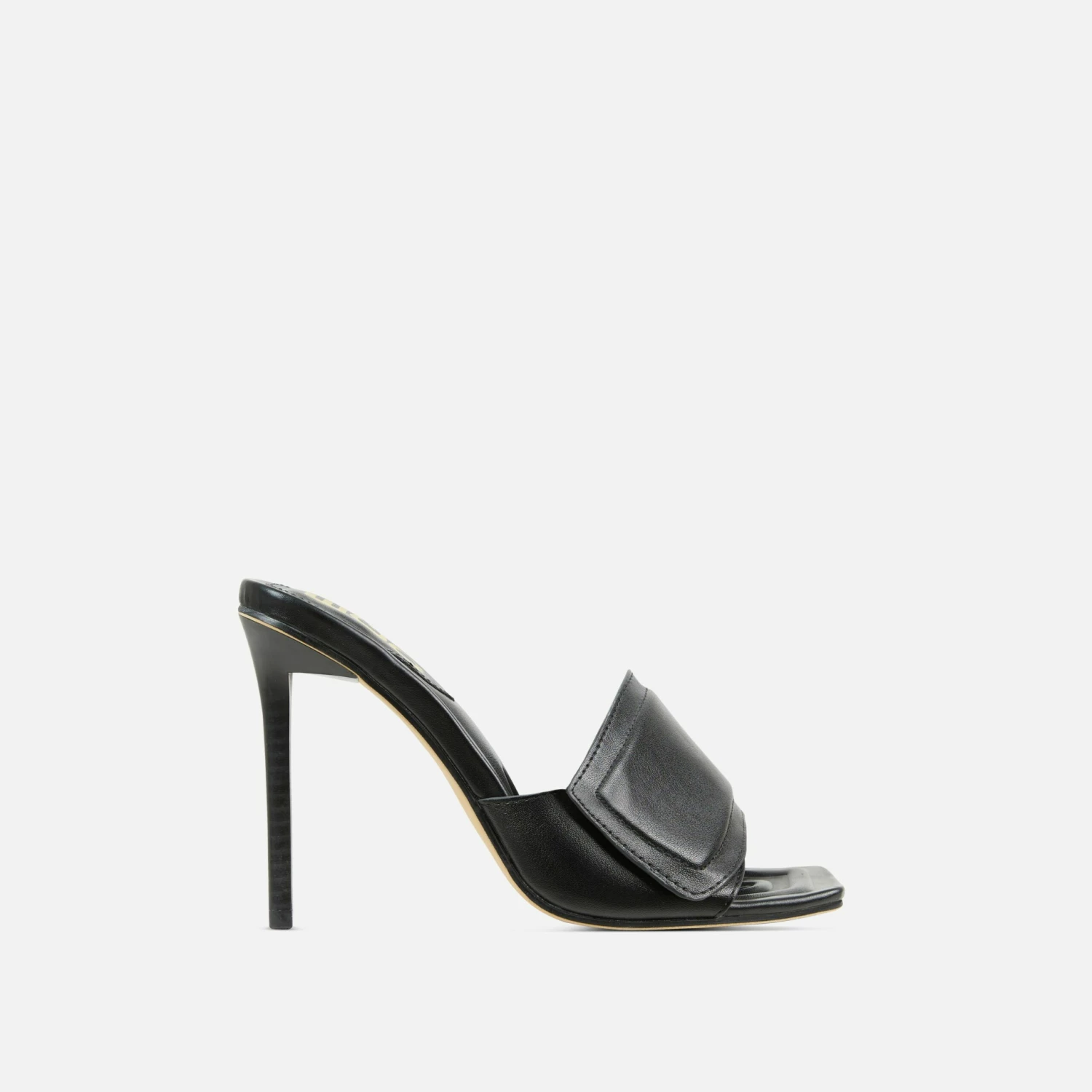 Every doll needs a pair of mules and we’re obsessed with these. Featuring a black faux leather material, a plush velcro strap, a square peep toe and a stiletto heel.