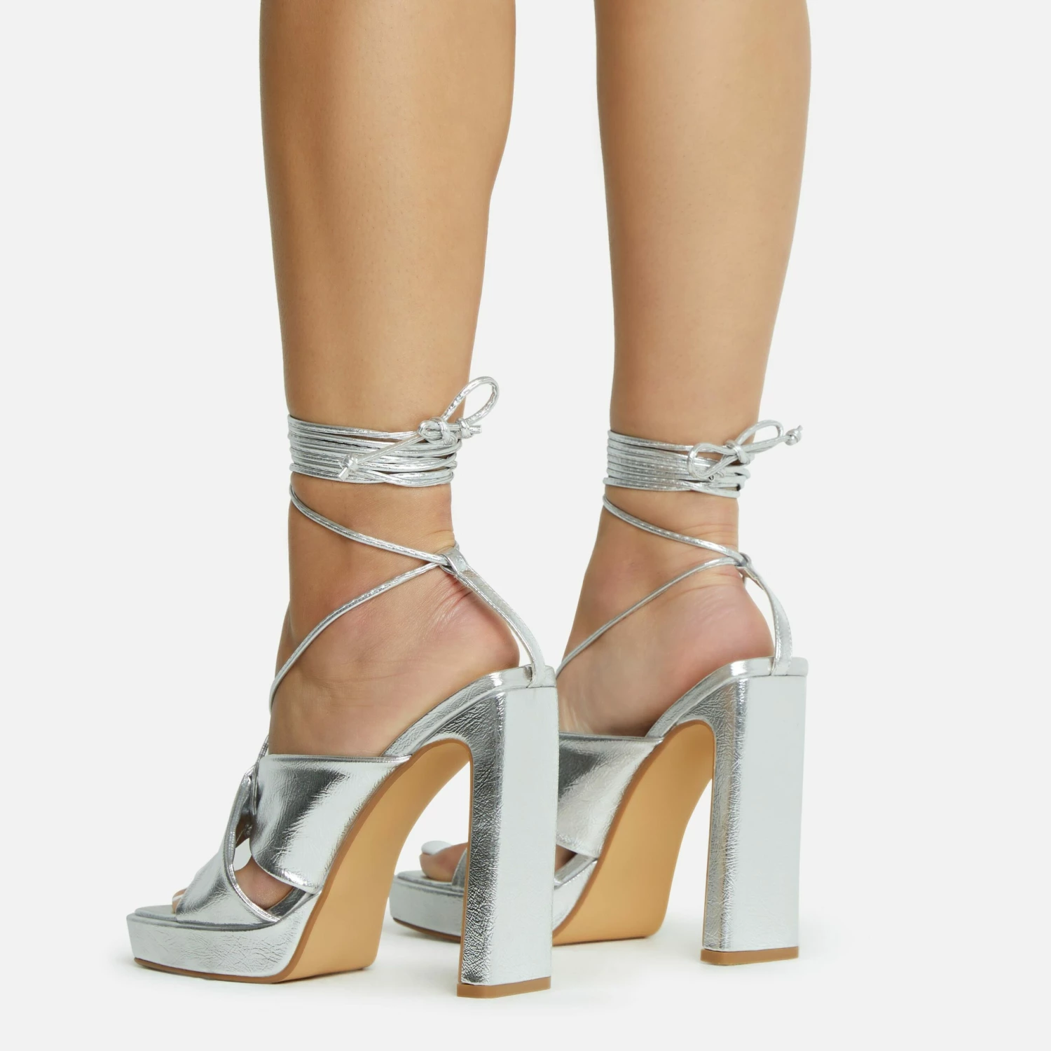 We love these heels for the party season doll. Featuring a silver metallic faux leather material, a lace-up design, a twisted strap and a thin heel.