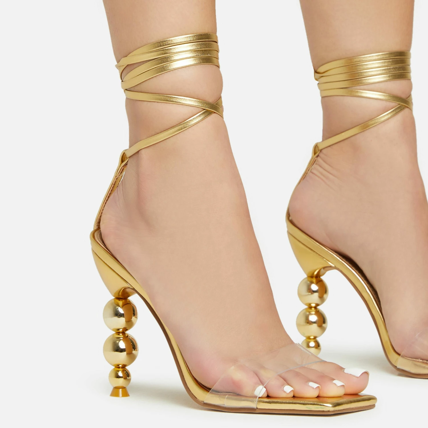 Take your look to whole new levels with these gorge heels doll. Featuring a pink linen material, a clear perspex strap, a lace-up design and a statement heel.