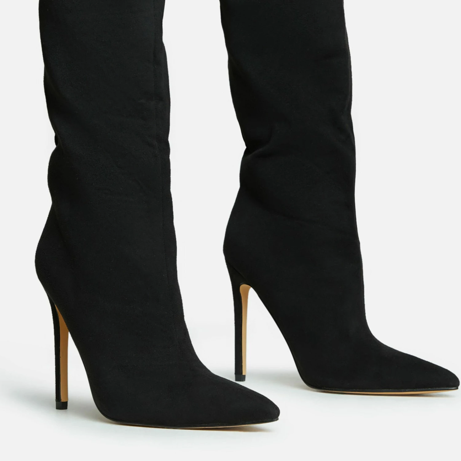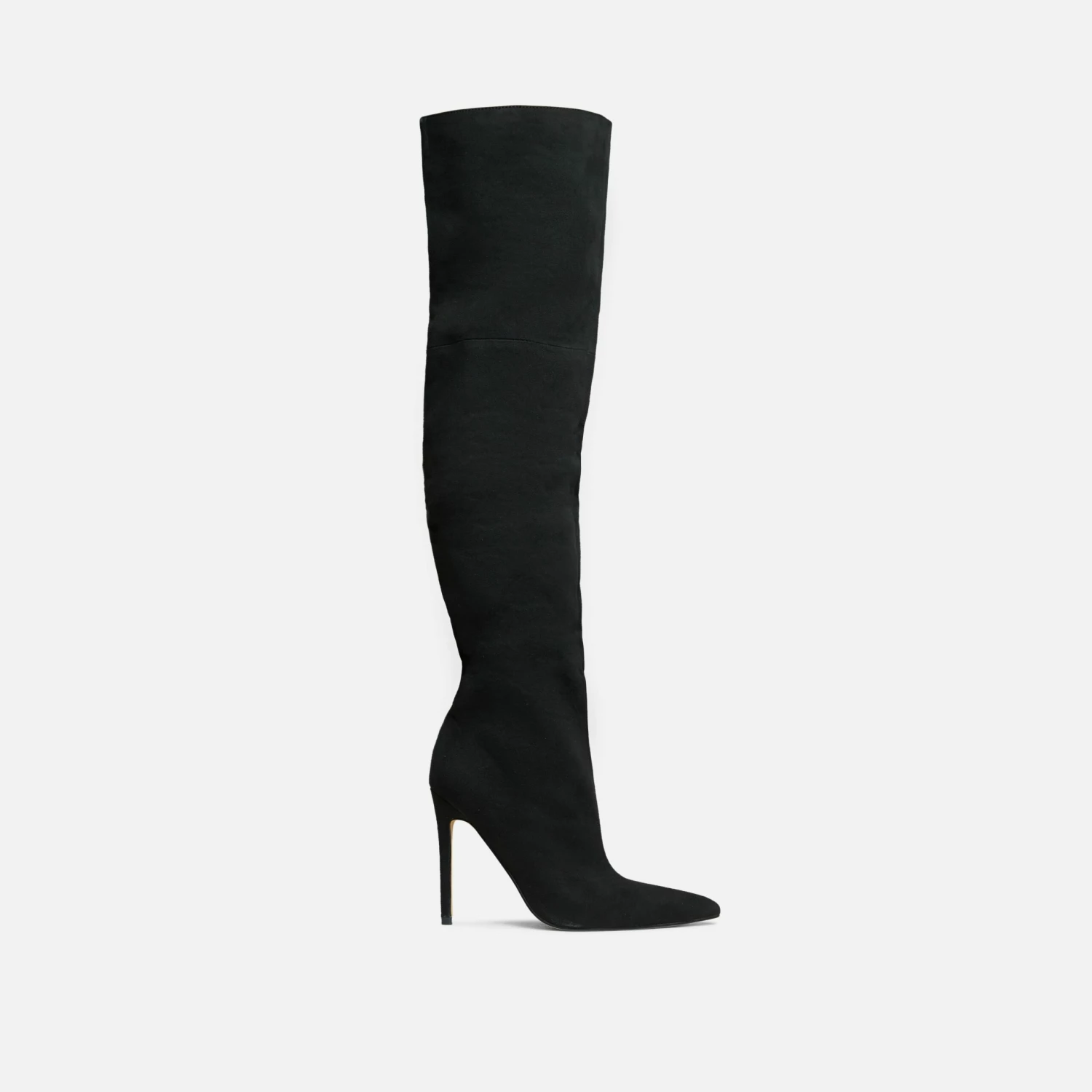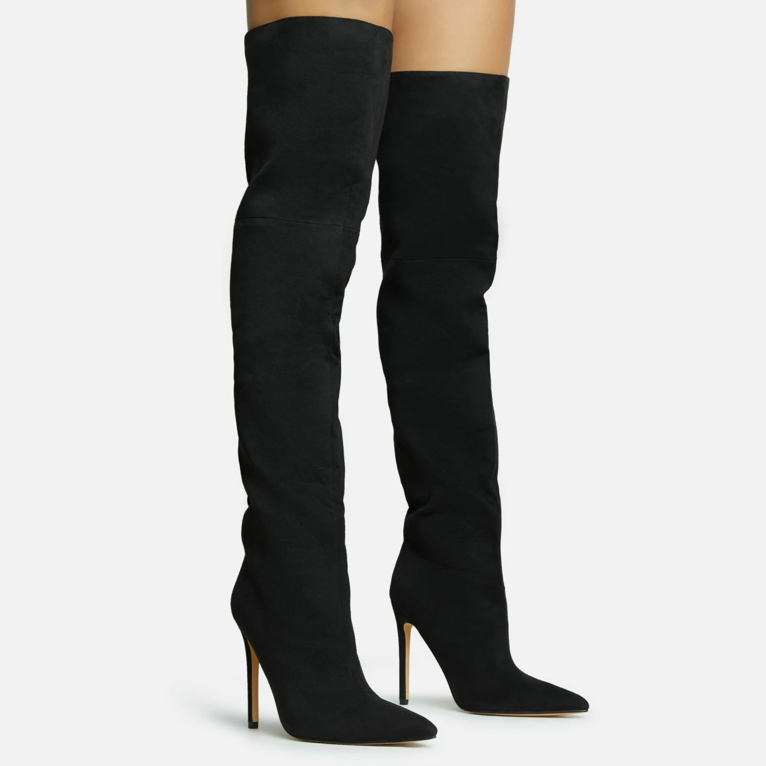 Accessorize your finished look with these killer boots. Featuring a black faux suede material, with a pointed toe, stiletto heel and an over the knee thigh high length.