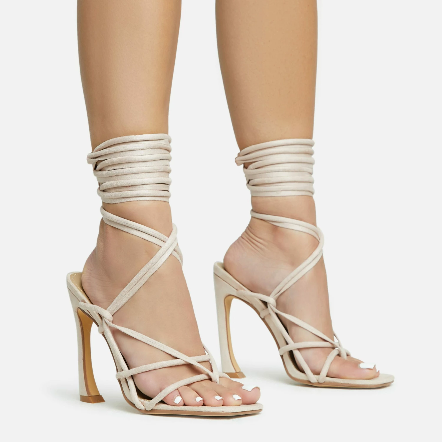 These heels are the perfect strappy heel to finish off your look girl. Featuring a nude faux suede material, a strappy design, a square toe and a thin block heel.