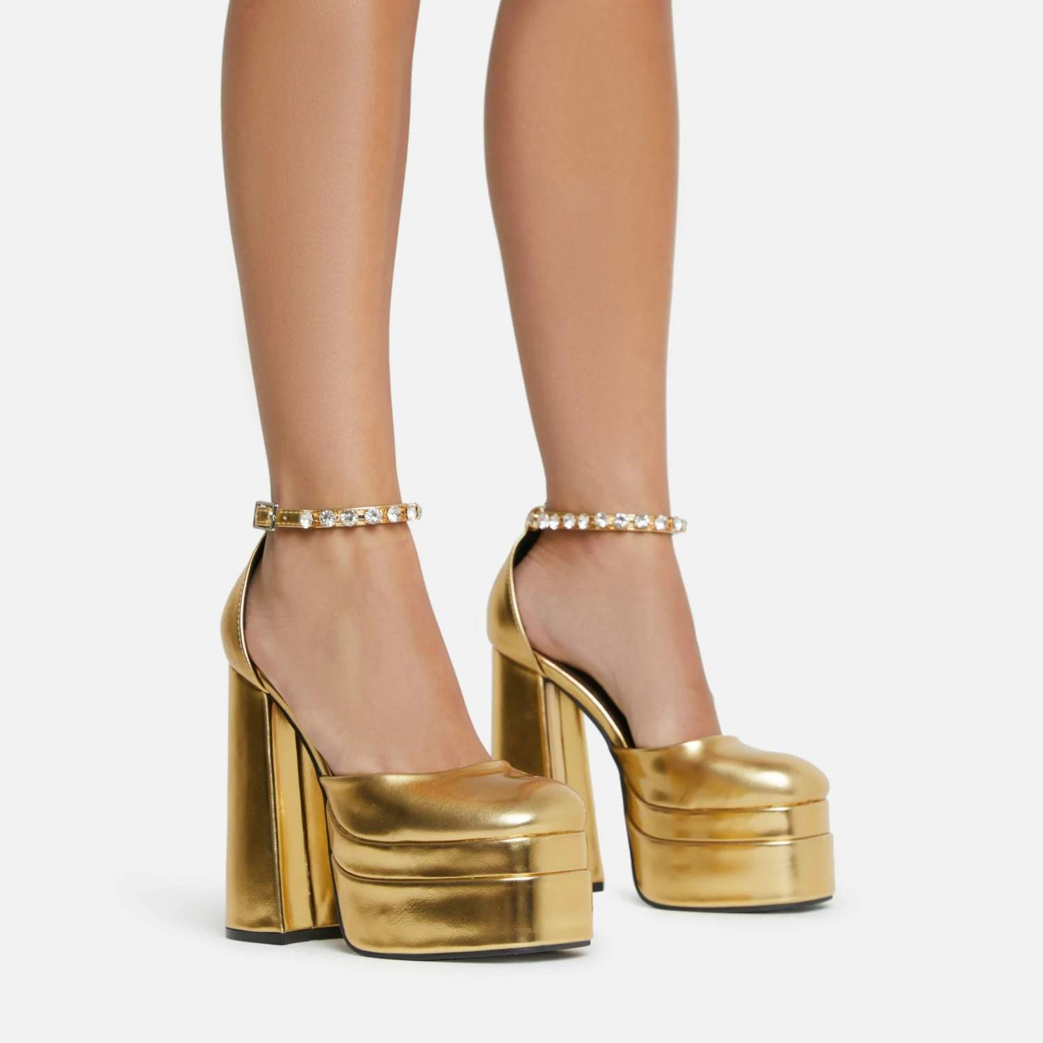 Make a bold entrance in these statement heels doll. Featuring a gold metallic faux leather material, with diamante strap detailing, a closed square toe and an extreme platform block heel.