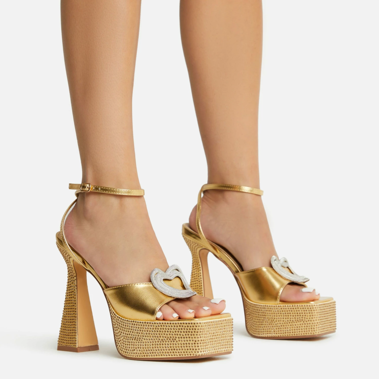 Elevate your evening look with these statement heels doll. Featuring a gold faux leather material, with diamante heart detailing, a square peep toe and a flared block heel.
