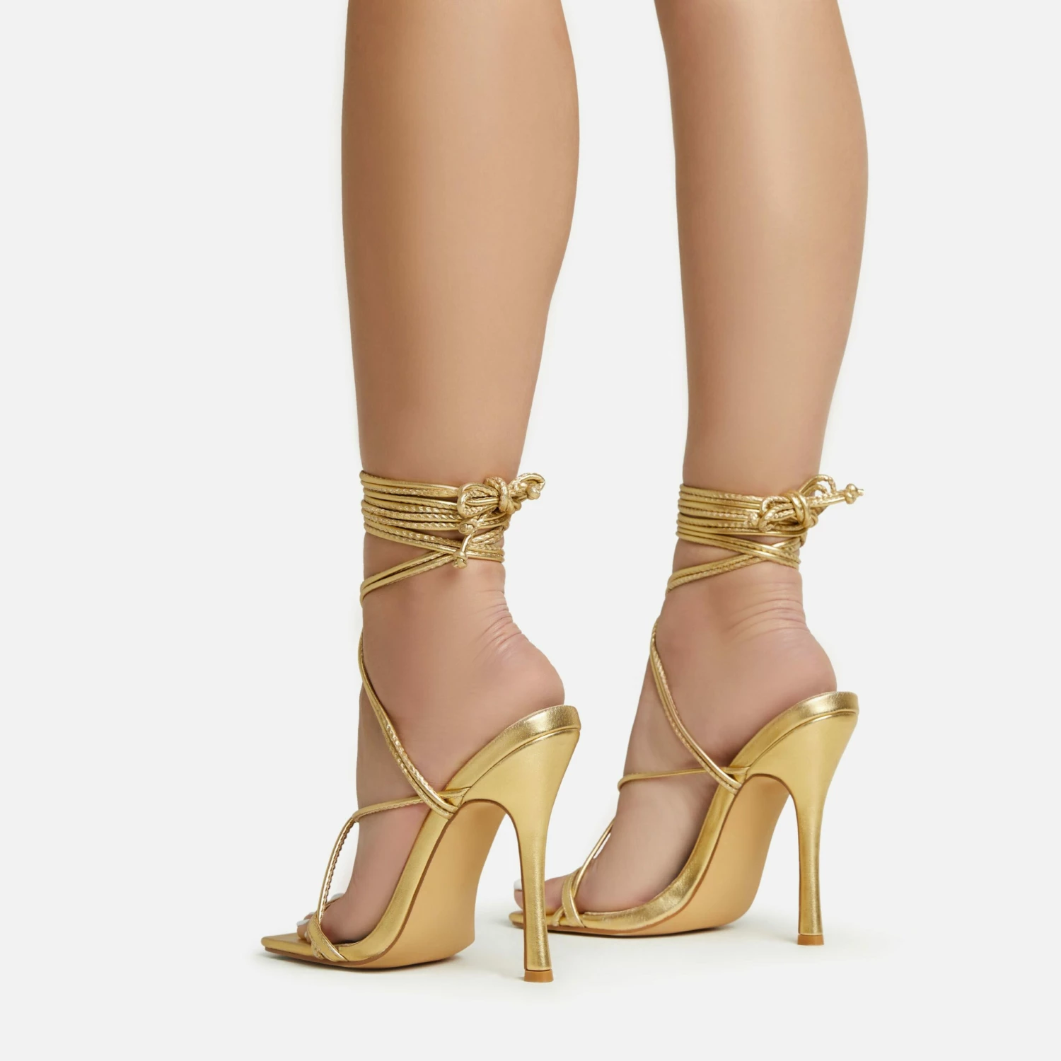 EGO Rose-Rouge Lace Up Clear Perspex Strap Square Toe Statement Metallic Heel In Beige Linen