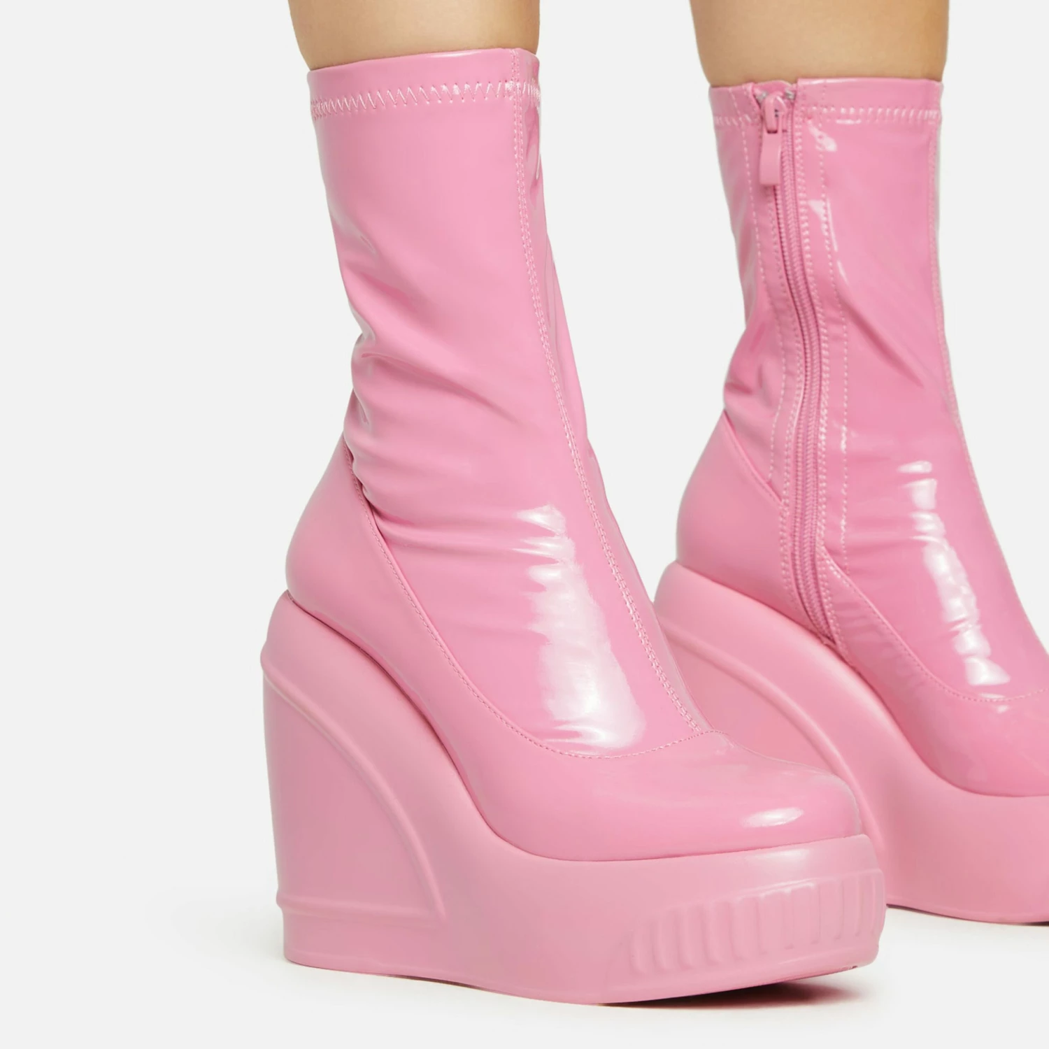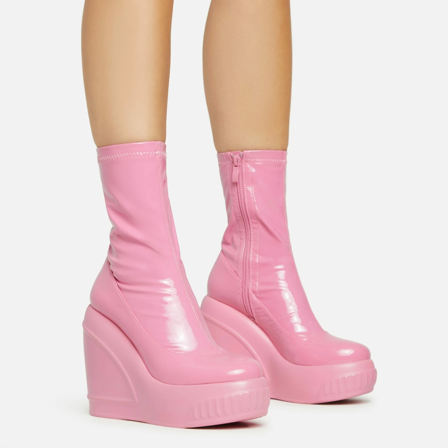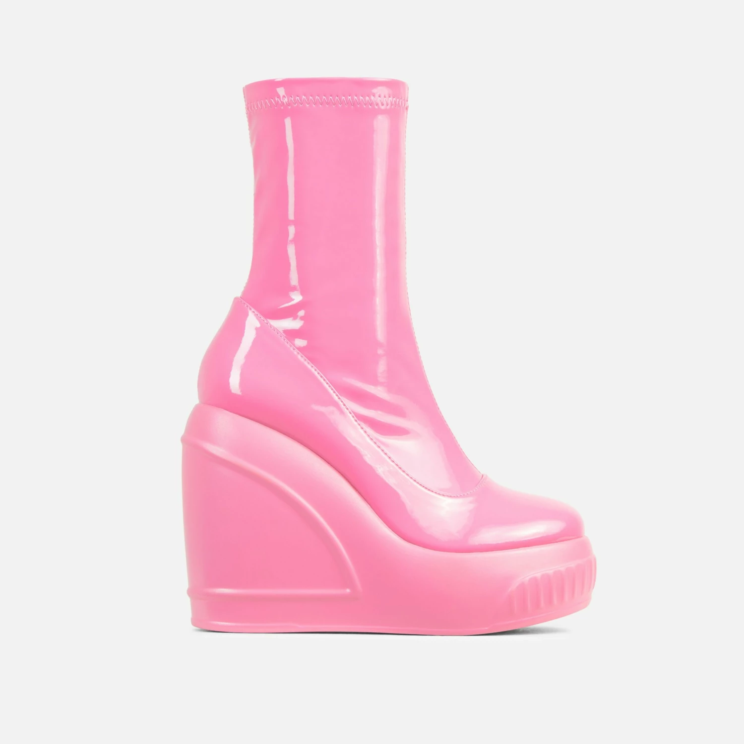 Stand out from the crowd with these boots girl. Featuring a pink patent material, a platform wedge, an ankle length and a sock boot design.