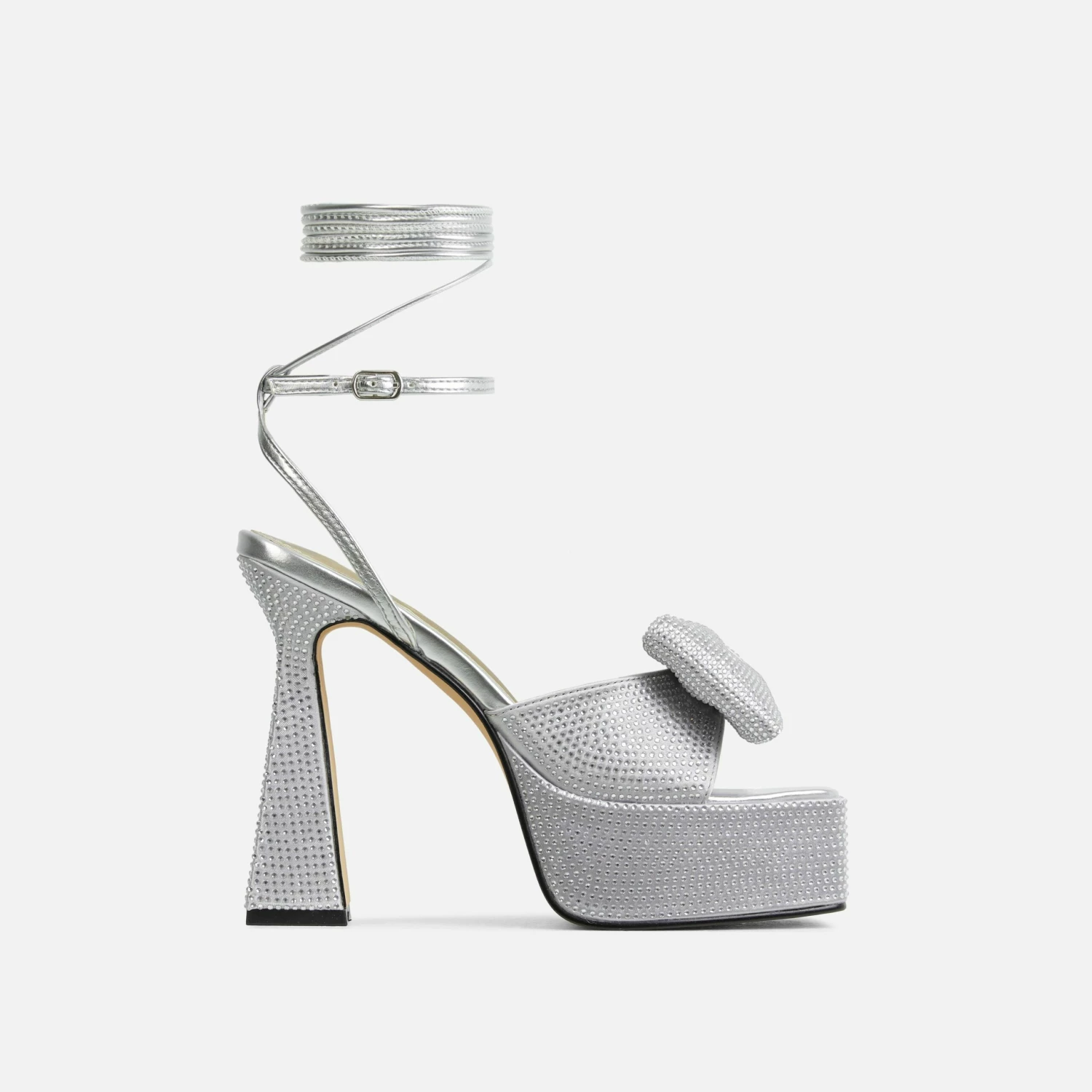 These heels were made to be seen in doll. Featuring a silver faux leather material, with diamante bow detailing, a platform sole, flared block heel, square peep toe and a lace up finish.