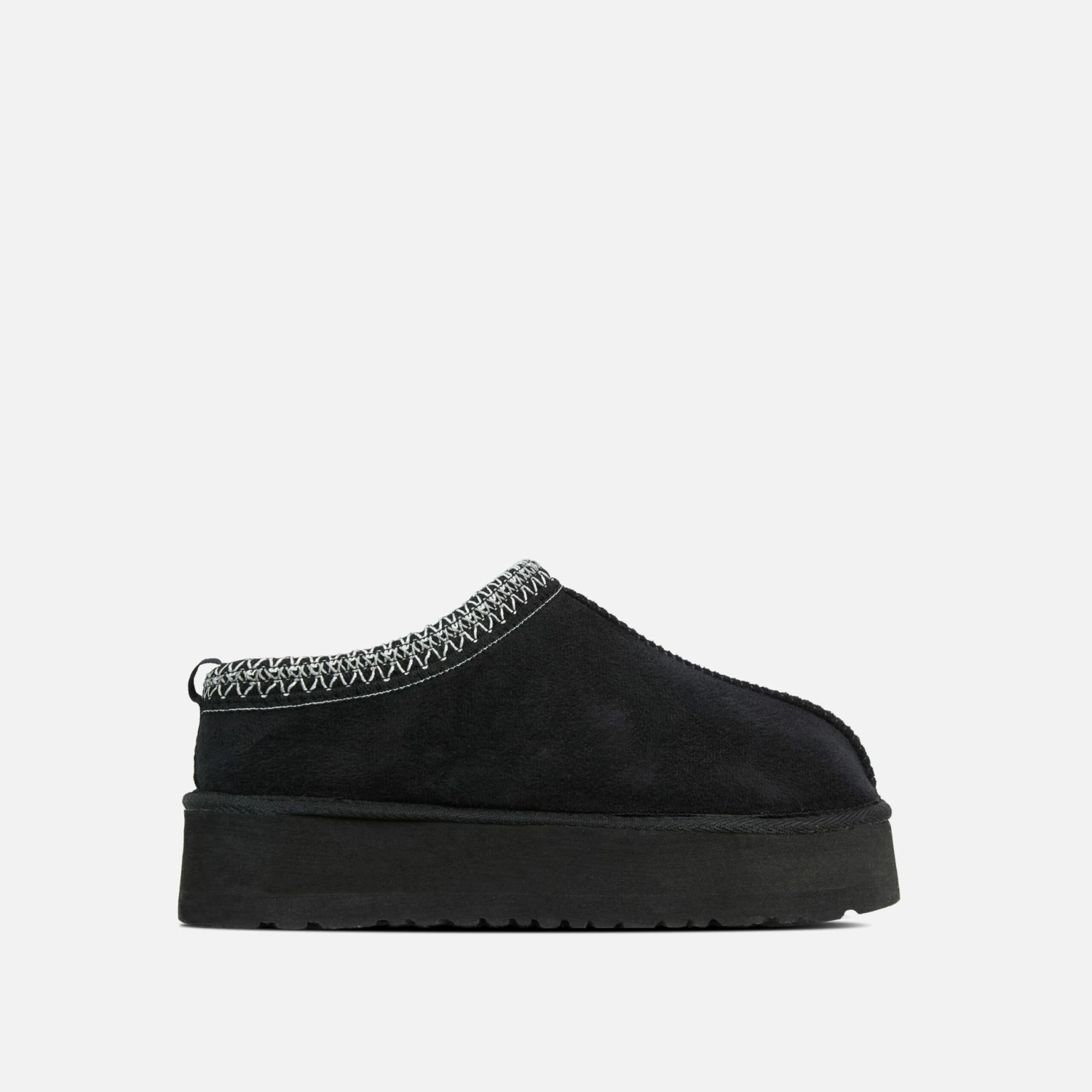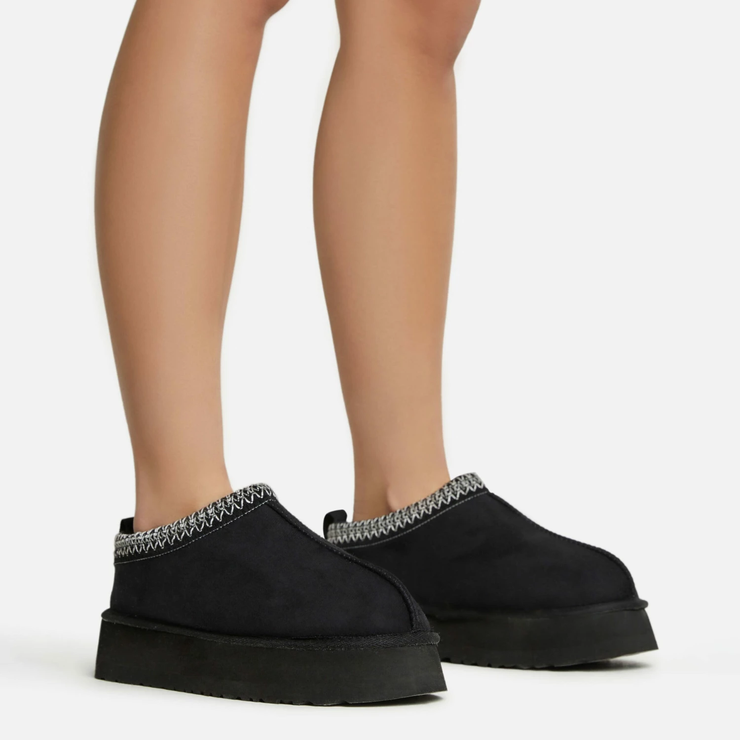 Hit refresh on your off duty look. Featuring a black faux suede material, with aztec detailing, faux fur lining, a platform sole and a slip on slipper design.