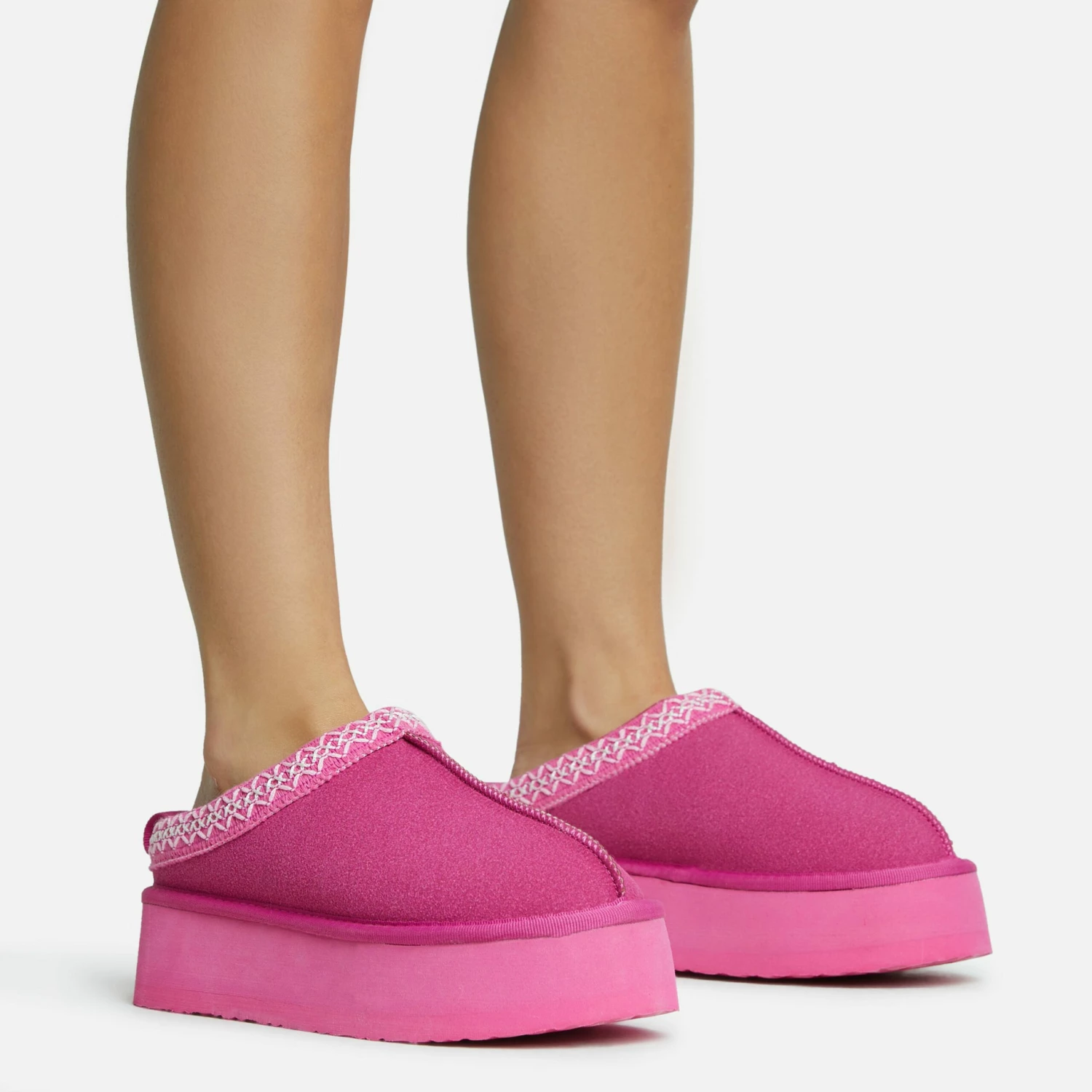 Update your comfy look with these must have slippers doll. Featuring a pink faux suede material, with aztec detailing, a platform sole and a slip on design.
