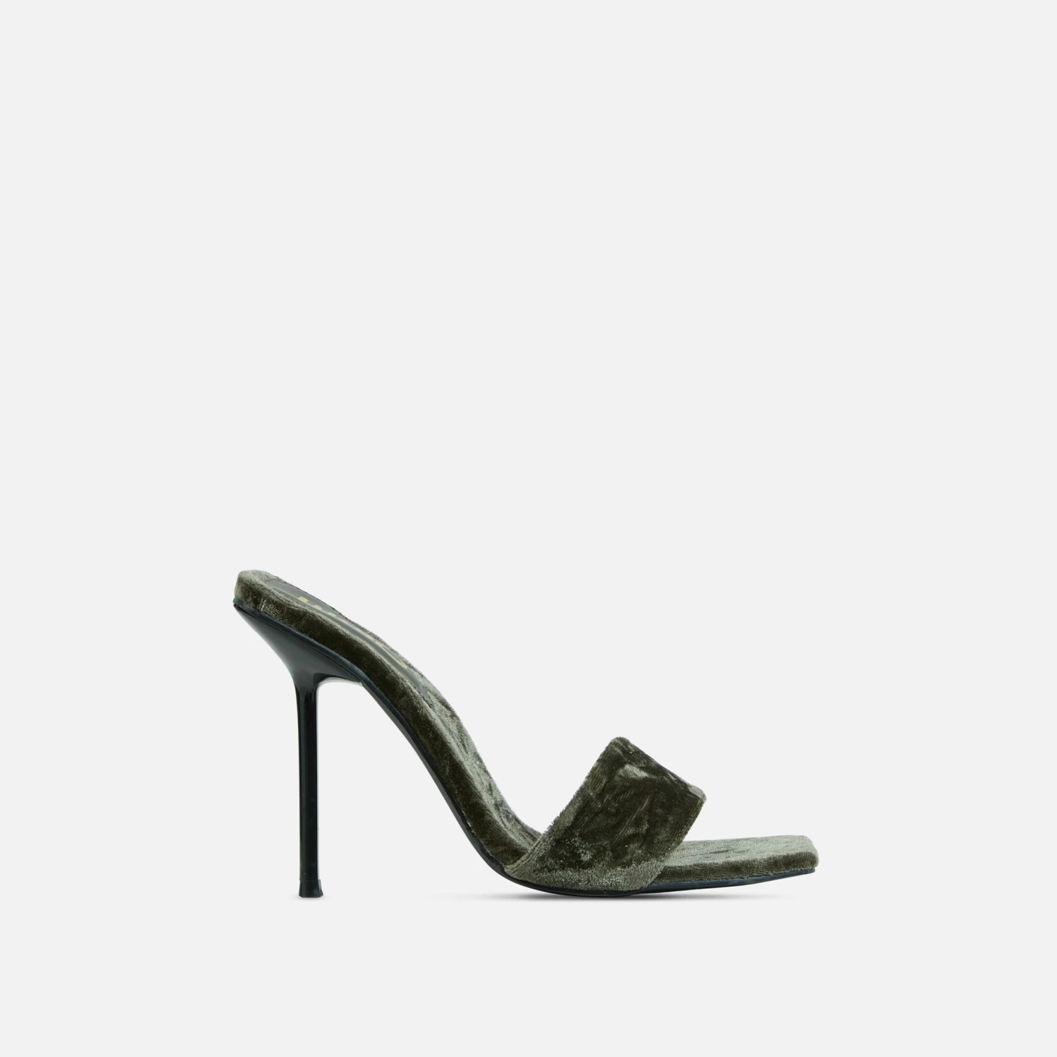 Keep on trend this season with these velvet heels doll. Featuring a khaki velvet material, an open square toe, a stiletto heel and a mule design.
