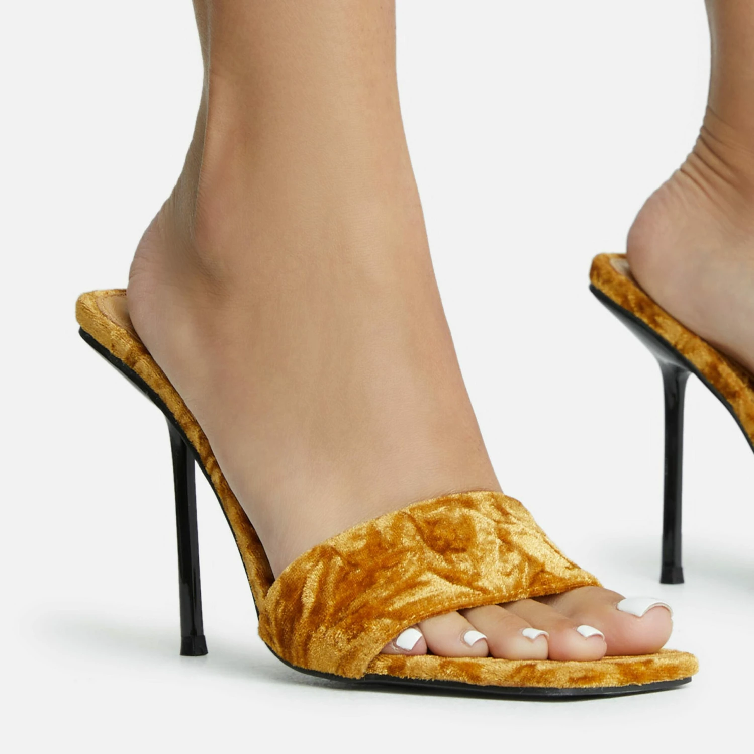 Take your look to new levels with these mules doll. Featuring a mustard velvet material, an open square toe, a stiletto heel and a mule design.