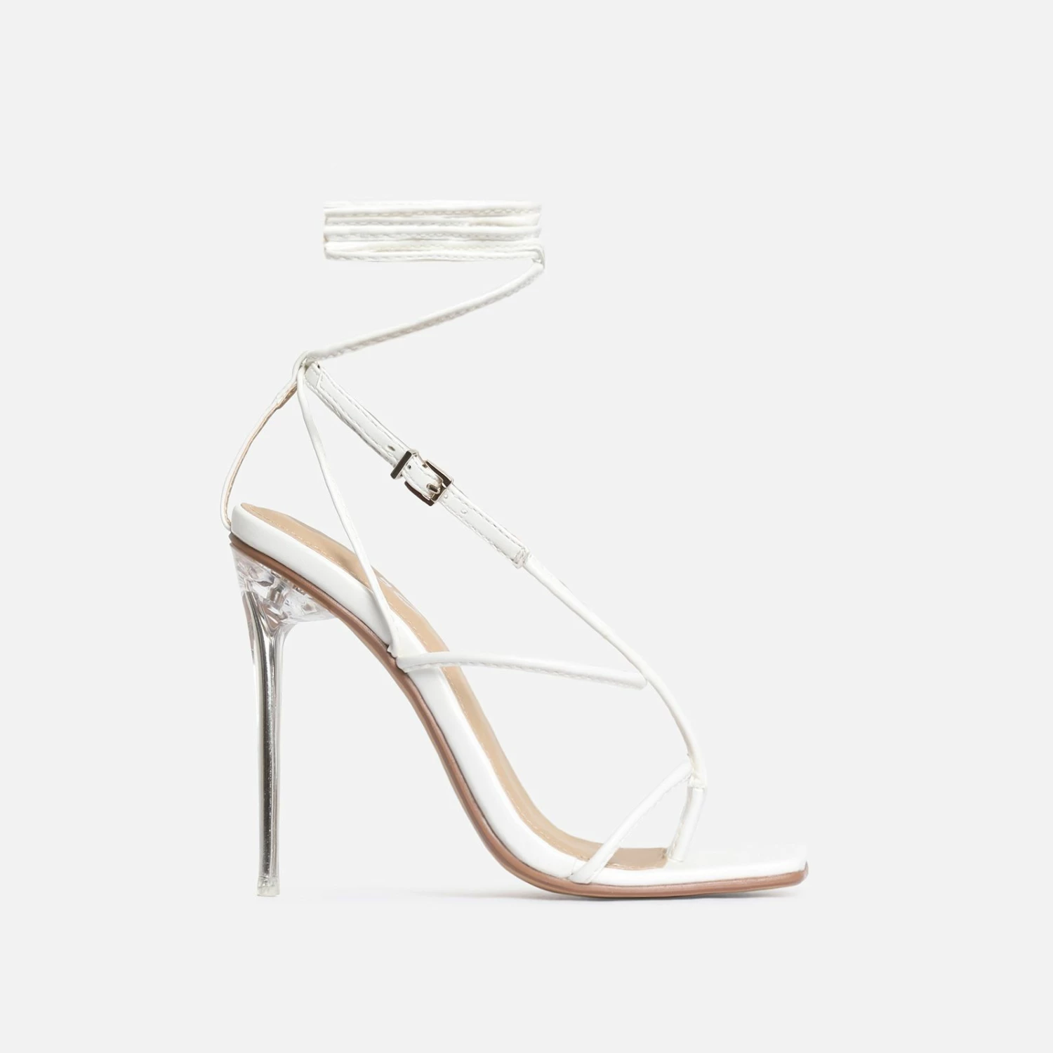 These heels are hot as hell! True features clear perspex stiletto heel, strappy lace up upper, square toe and white faux leather finish.