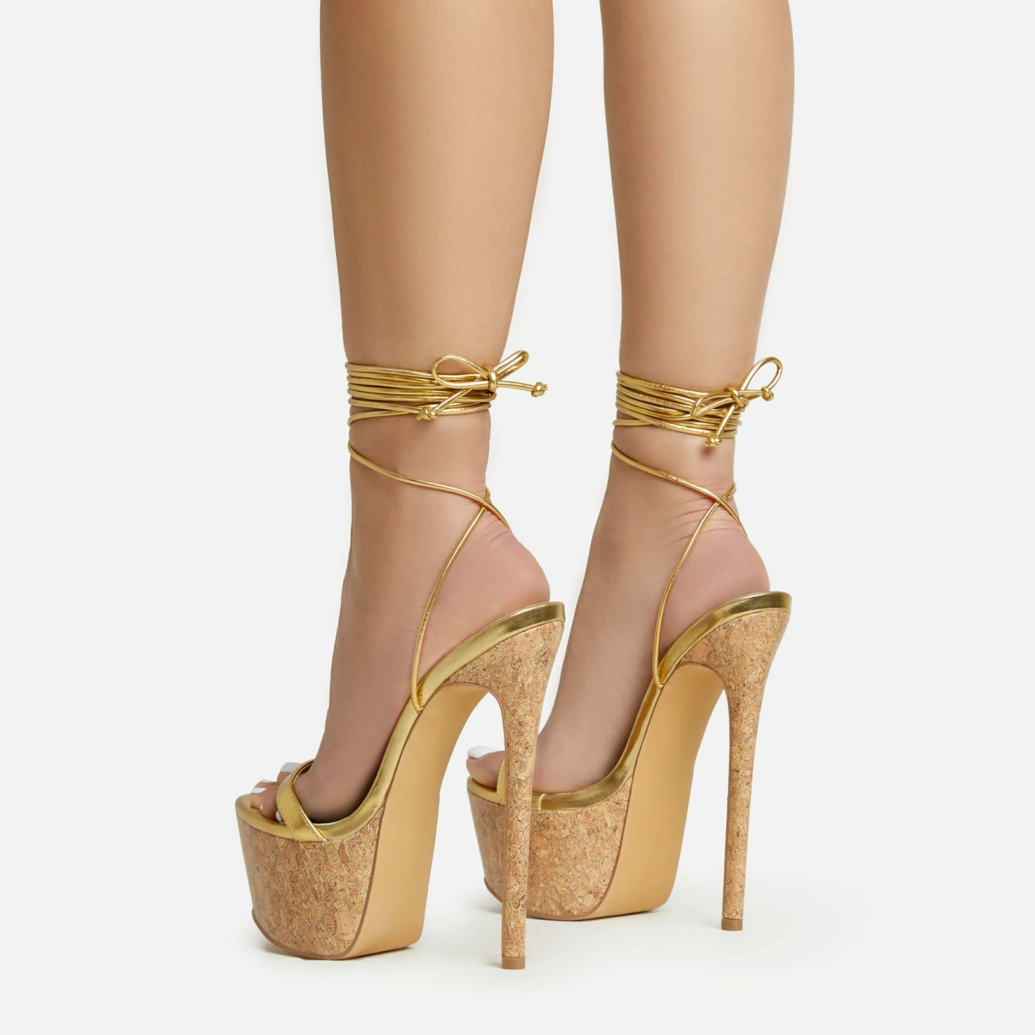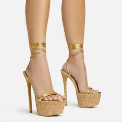 These heels are sure to make the crowd stop and stare doll. Featuring a gold faux leather material, a cork platform, a stiletto heel and a lace-up design.