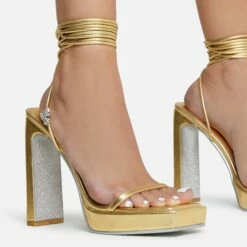 EGO Beggin Lace Up Diamante Strap Detail Square Toe Wedge Heel In Silver Faux Leather