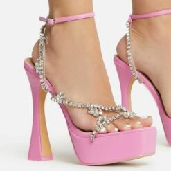 EGO Show-Ahead Clear Perspex Strap Diamante Detail Platform Flared Block Heel In Pink Faux Leather