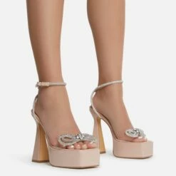 EGO Sugar-Fire Diamante Bow Perspex Strap Square Toe Platform Flared Block Heel In Nude Patent