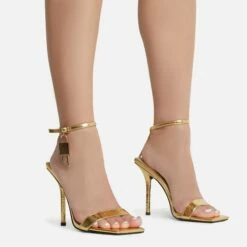 EGO Waves Lace Up Strappy Square Toe Flared Block Heel In Gold Croc Print Faux Leather