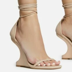EGO Flamingo Lace Up Faux Feather Detail Square Toe Metallic Thin Block Heel In Nude Faux Leather
