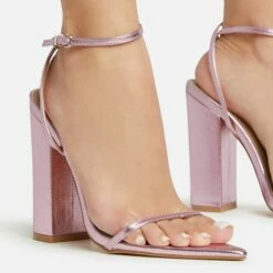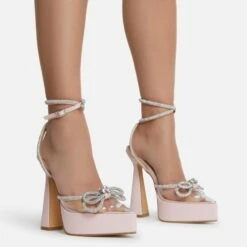 EGO Candy-Love Diamante Bow Perspex Pointed Toe Platform Flared Block Heel In Pink Faux Leather