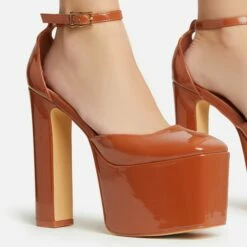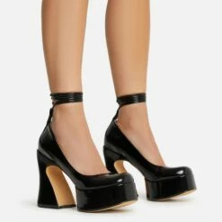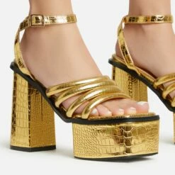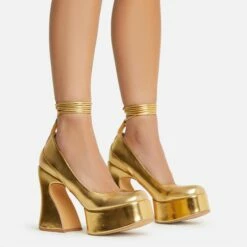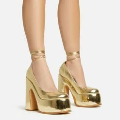 EGO Ahead-Of-The-Curve Lace Up Square Closed Toe Platform Curved Block Heel In Gold Faux Leather