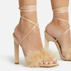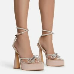 EGO Romantic Diamante Detail Lace Up Square Toe Clear Perspex Sculptured Heel In Orange Faux Leather