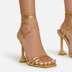 EGO Gemini Strappy Lace Up Square Toe Platform Thin Block Heel In Gold Croc Print Faux Leather